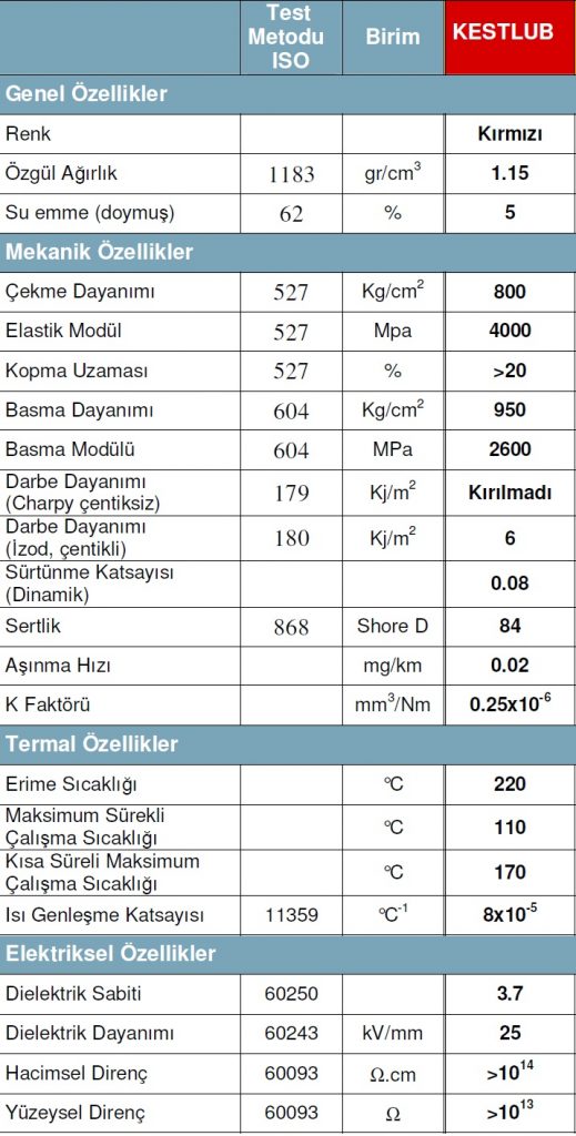 Yüzeylerde yapışmayı engeller. Düşük sürtünme katsayısına sahip olup, yüksek kayma özellikleri sunar. Kolayca montaj ve demontaj yapılabilir. Yüksek aşınma direnci ile uzun ömürlüdür. Mekanik işleme işlemleri oldukça kolaydır.